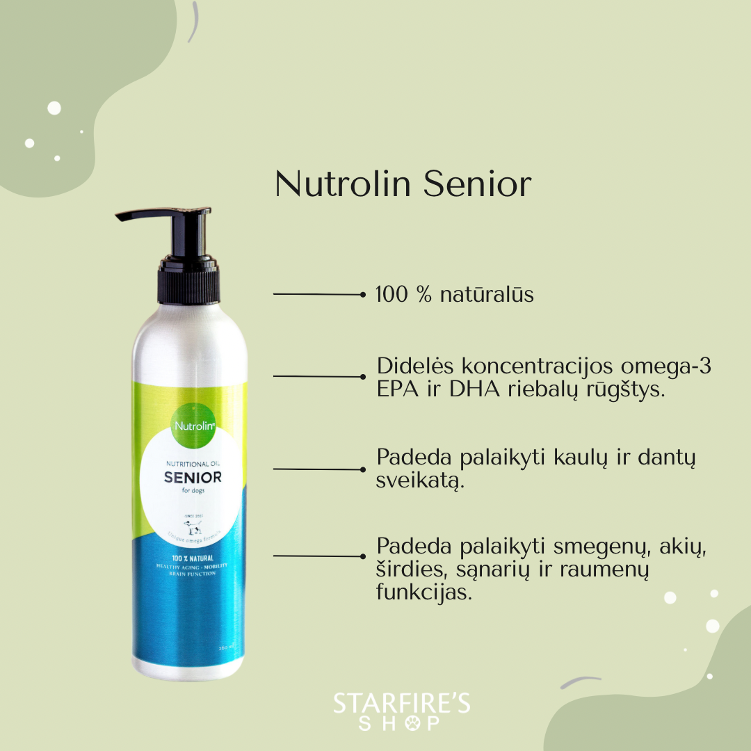 Norėdami suteikti papildomą pagalbą, išbandykite Nutrolin® Senior – Omega-3 turtingą žuvų aliejų su sinerginėmis maistinėmis medžiagomis, palaikančiomis vyresnio šuns judrumą, smegenų veiklą, akis, širdį ir dantis.